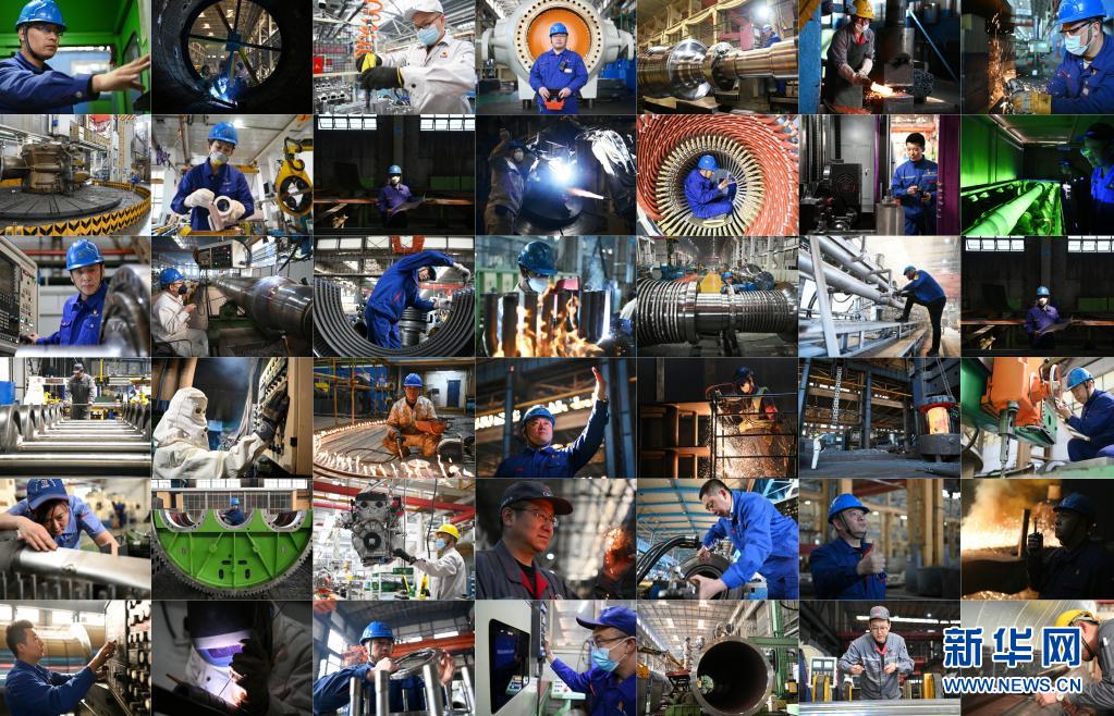中国一重、哈电集团、中车齐车集团等大国重器企业生产一线的共产党员在岗位上生产作业(拼版照片,2021年4月摄)。