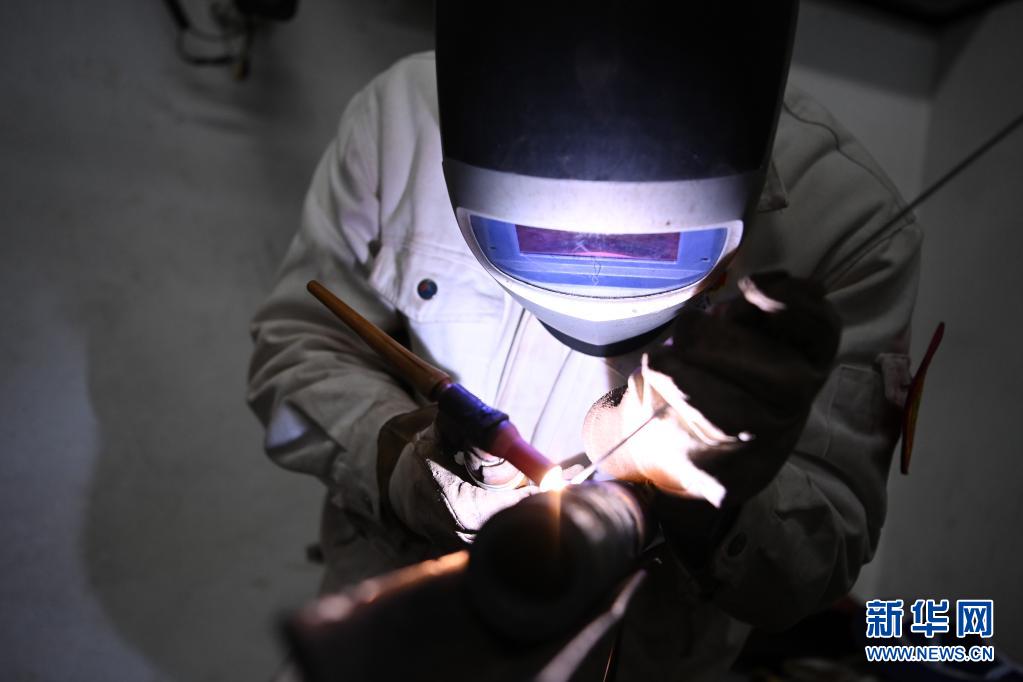 哈电集团哈尔滨锅炉厂有限责任公司电焊工舒裕在电焊作业中。“60后”舒裕曾获“新长征突击手标兵”“龙江工匠”“黑龙江省技术能手”等称号,作业时他戴着防护头盔仿佛“钢铁侠”(4月14日摄)。