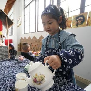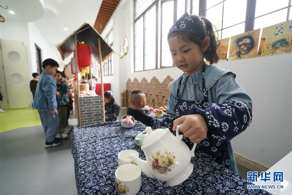 4月27日,在南京市江宁区禄口街道曹村村幼儿园,小朋友进行角色扮演游戏。