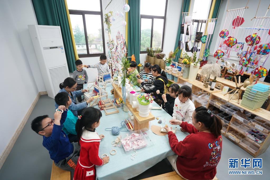 4月27日,在南京市江宁区禄口街道曹村村幼儿园,小朋友上手工课。