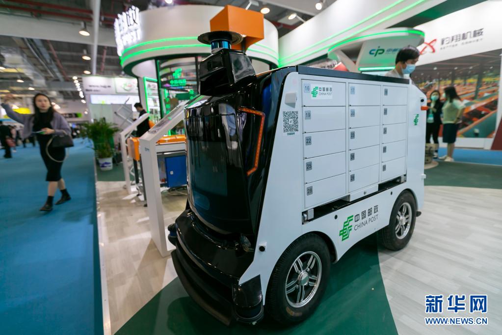 4月27日在中国邮政展区前拍摄的无人投递车,无人投递车主要应用于小区、园区、校园等封闭和半封闭的场景。