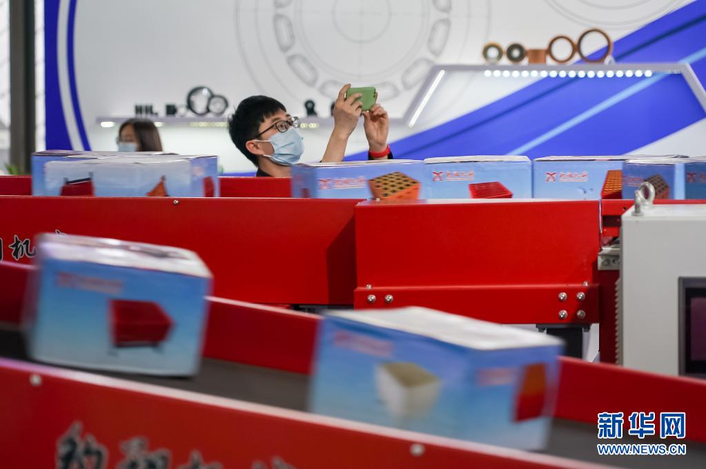 4月27日,观众在自动化物流输送分拣系统前拍摄。