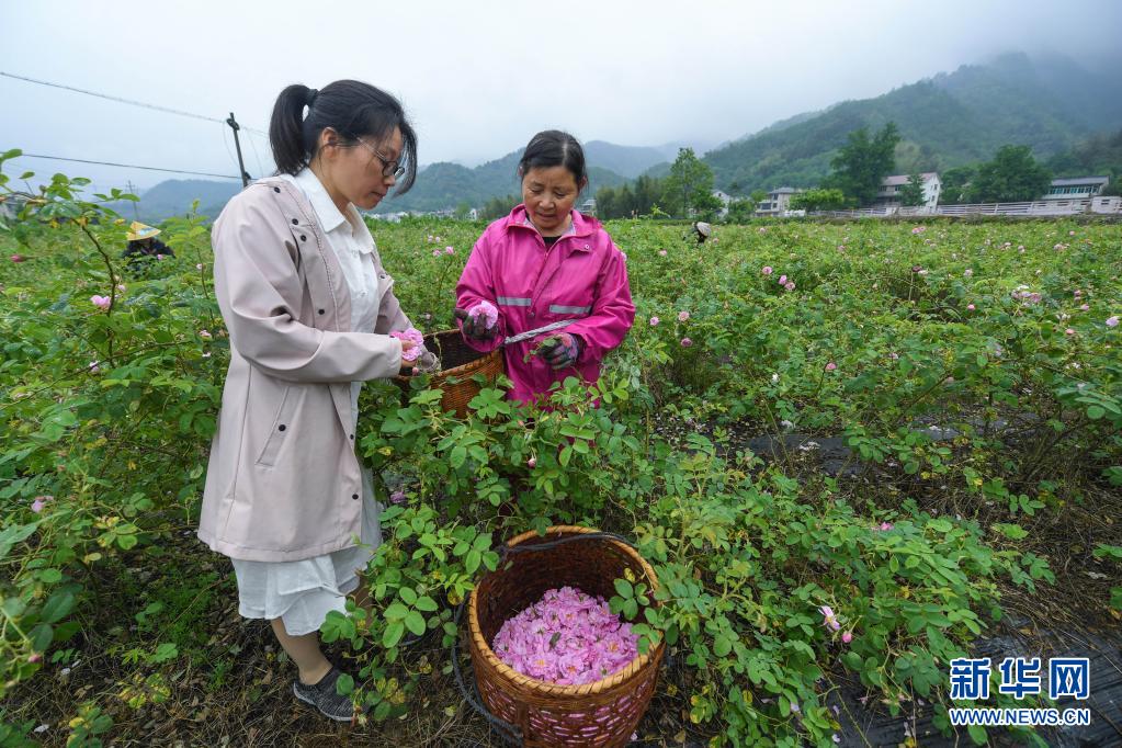 4月27日,在清凉峰镇新峰村玫瑰园里,玫瑰园承包户陈雨霞(左)给花农讲解玫瑰花采摘标准。她承包了200多亩玫瑰园,种植的玫瑰花用于制作花茶、精油、玫瑰花酱等产品。