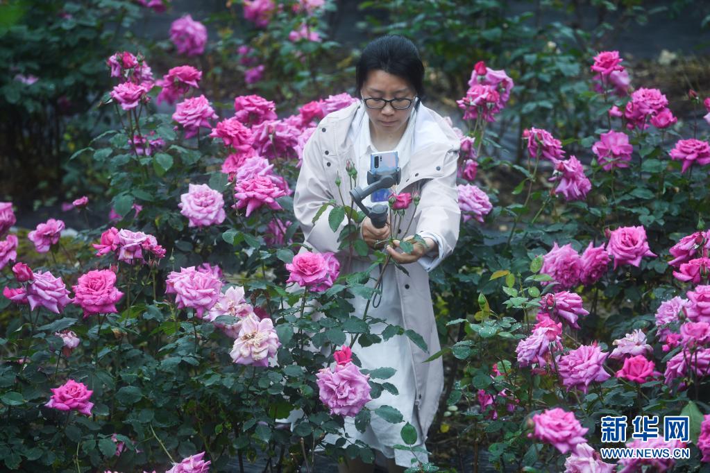 4月27日,在清凉峰镇新峰村玫瑰园里,玫瑰园承包户陈雨霞进行网络直播。