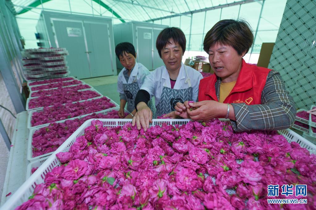4月27日,在清凉峰镇新峰村玫瑰园里,党员农技志愿者(右)指导工人挑选合格的玫瑰花。