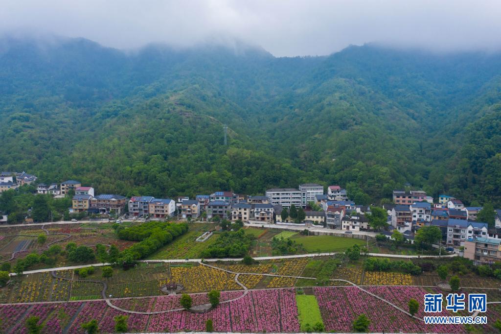 4月27日拍摄的杭州市临安区清凉峰镇新峰村玫瑰园(无人机照片)。