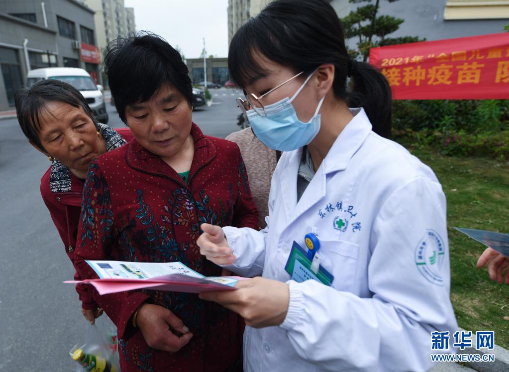 4月27日,东林镇卫生院医护人员在东明村新村向村民进行新冠病毒疫苗全民免费接种宣介。