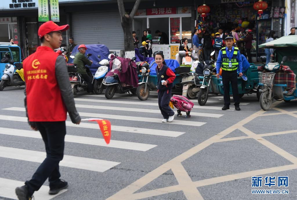 4月27日,湖州市交警支队东林中队的辅警和党员志愿者在路口引导文明出行。