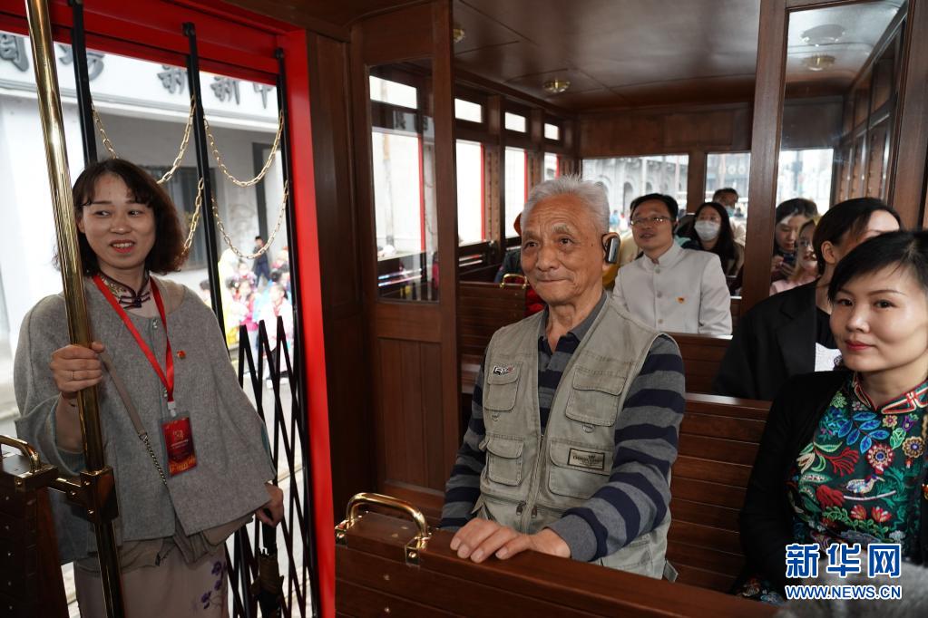 4月27日,有50多年党龄的徐志英(中)在上影车墩影视基地乘坐“初心号”红色巴士,重温党史。