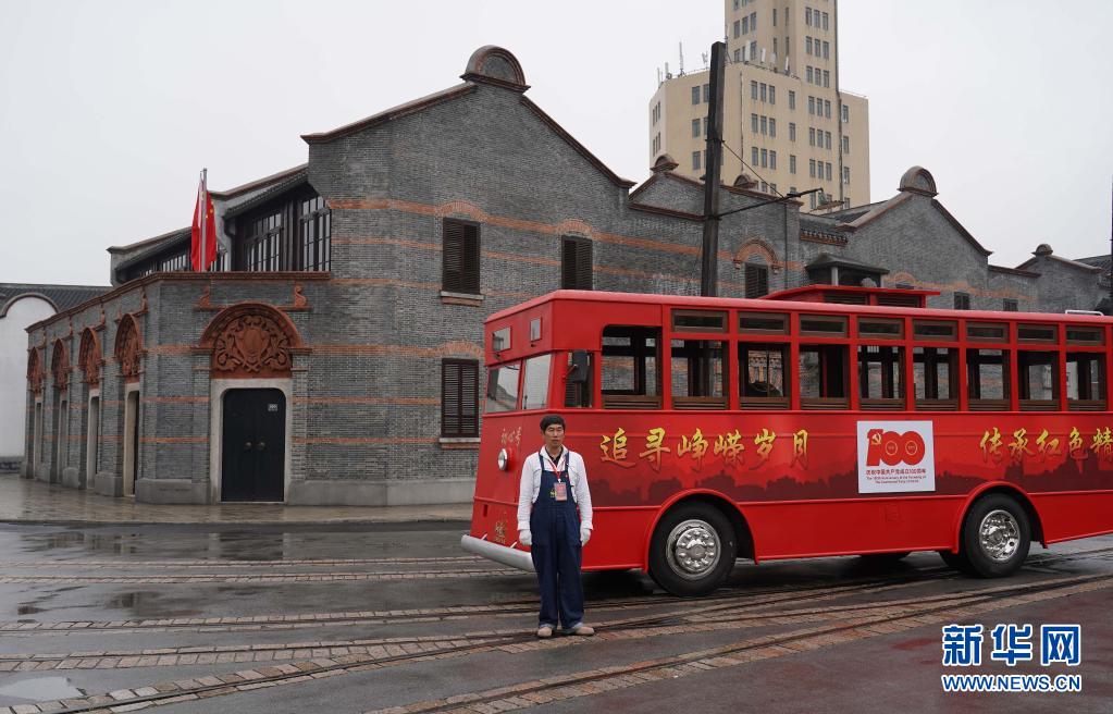 4月27日,在上海电影集团车墩影视基地,曾在电影《开天辟地》中作为道具的“初心号”红色巴士停靠在为拍摄电影《1921》按1:1比例建造的中共一大会址影视建筑前。