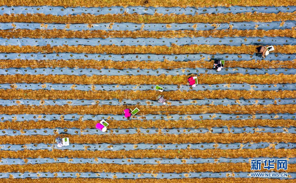 4月27日,村民在新阳村工业辣椒种植基地栽种辣椒幼苗(无人机照片)。