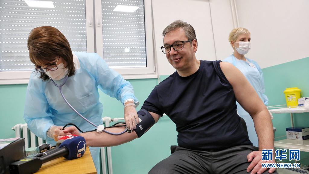 当地时间4月27日中午,塞尔维亚总统武契奇在塞南部多列瓦茨市普科瓦茨村卫生防疫站接种了第二剂中国国药集团新冠灭活疫苗。这是武契奇在接种前接受血压检测。