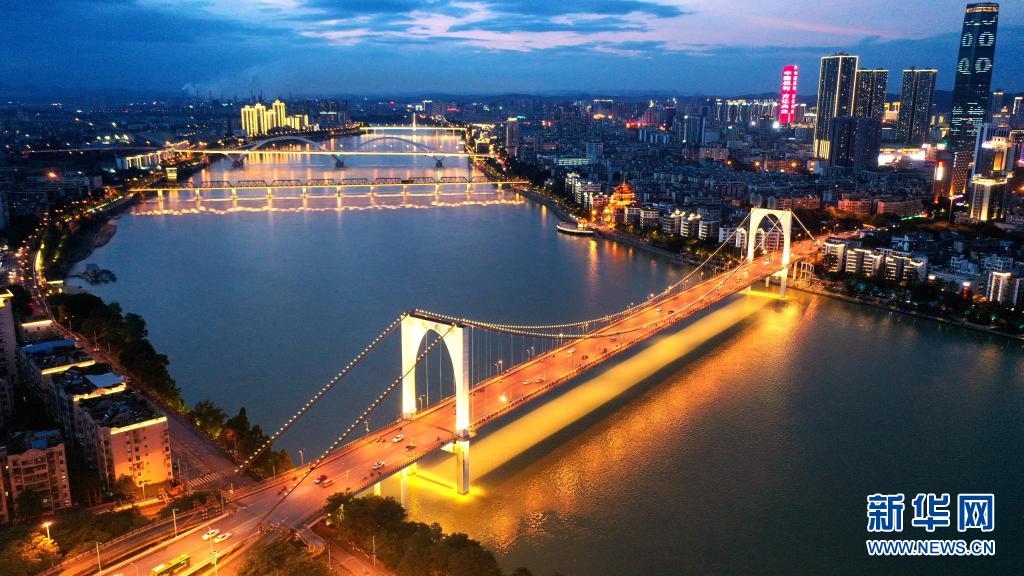曾是“酸雨之都”的柳州,现在变成了青山绿水的宜居城市,这是柳州市的夜景(2020年6月18日摄,无人机照片)。新华社记者 张爱林 摄