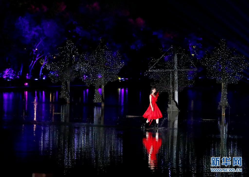 4月27日,模特在杭州西湖展示中国十佳服装设计师应翠剑设计的秋冬时装。