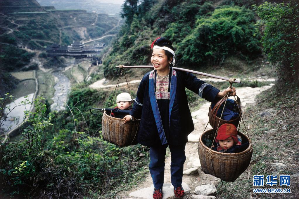 这是阎雷于1989年在广西三江侗族自治县独峒镇唐朝村拍摄的“挑担妈妈”阳奶群建和她的两个儿子。