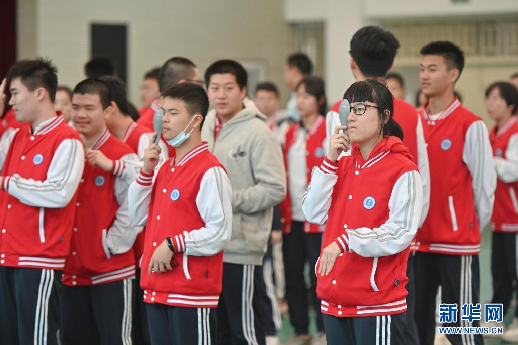 4月28日,在福州第二中学,学生在视力筛查中辨识视力表。