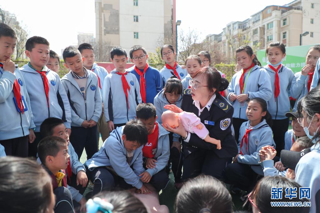 4月28日,在甘肃省兰州市华侨实验学校,甘肃省医师协会急诊医师分会工作人员给学生演示急救技能。