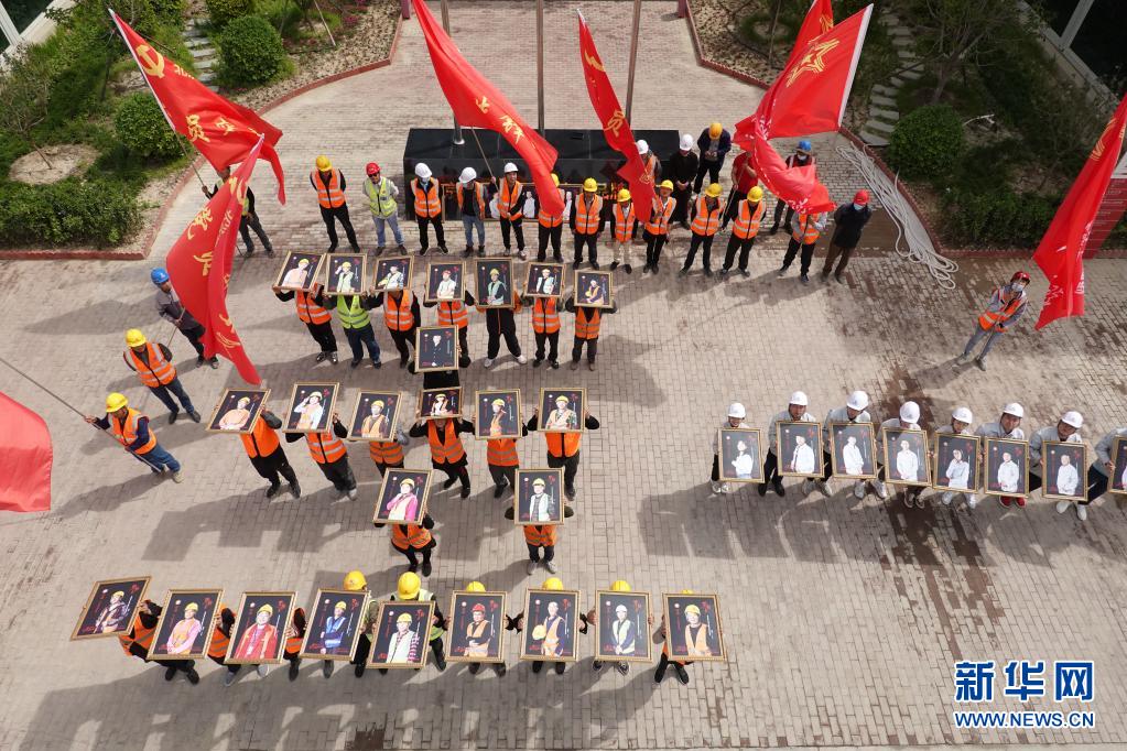4月28日,劳动者用自己的微笑照片组成“五一”字样。