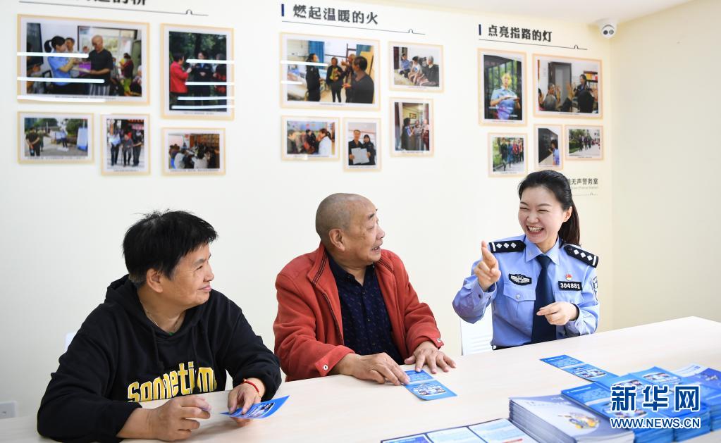 4月27日,何巧(右)在磁建村社区警务室谈心角与聋哑群众交流。新华社记者 王全超 摄