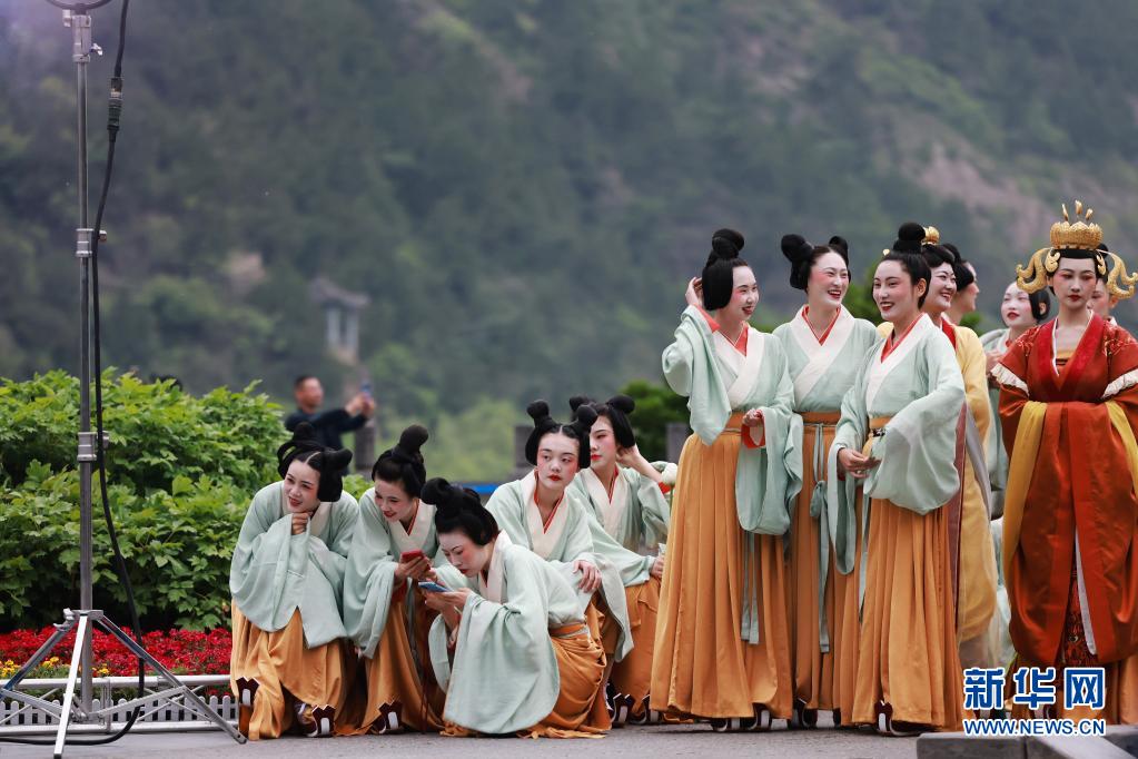 在龙门石窟景区礼佛台,演员们在拍摄间隙休息(4月25日摄)。新华社记者 许雅楠 摄