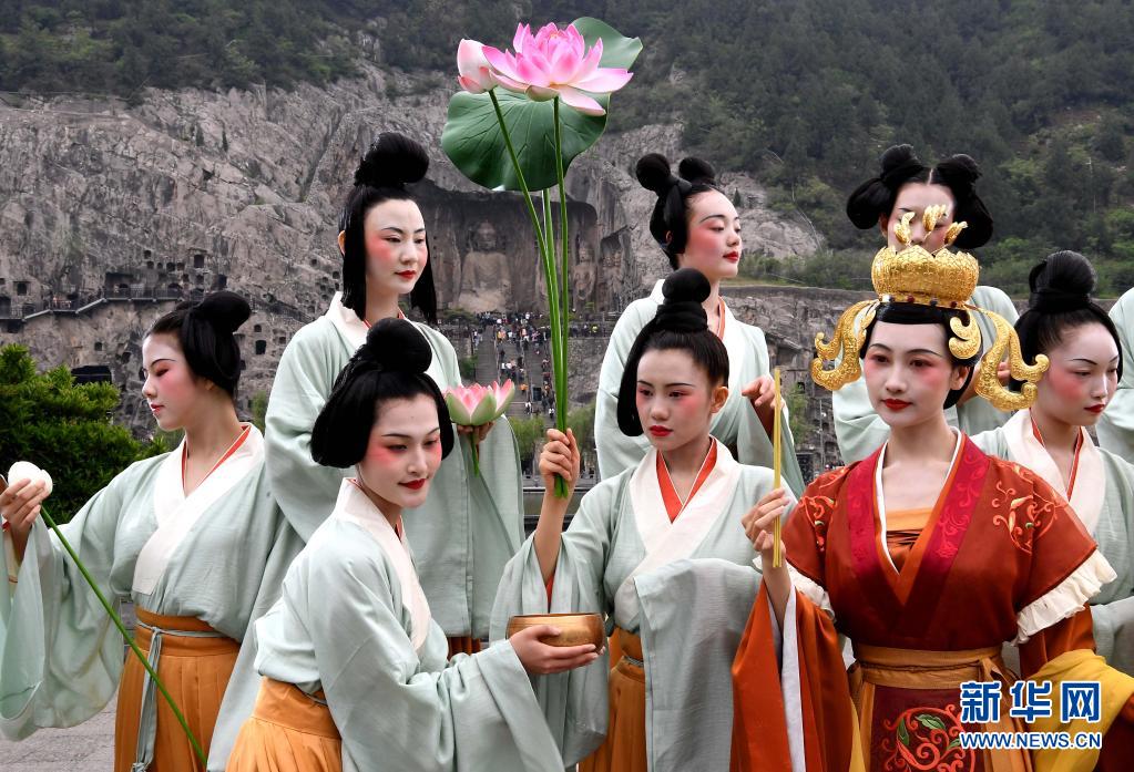 演员在洛阳龙门石窟景区礼佛台演绎《文昭皇后礼佛图》(4月25日摄)。新华社记者李安摄