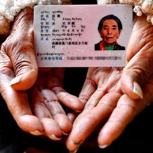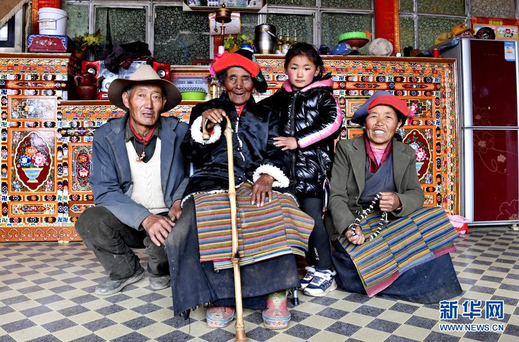 拉确老人(左二)和大女婿巴桑(左一)、大女儿桑姆(右一)及重外孙女白玛央拉一起在家中合影(4月16日摄)。新华社记者 张汝锋 摄