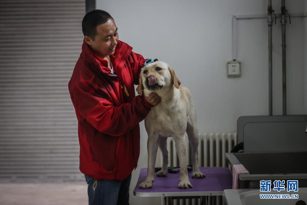 4月22日,中国导盲犬大连培训基地的训导员付明岩为在训犬“沐沐”清理毛发。新华社记者 潘昱龙 摄
