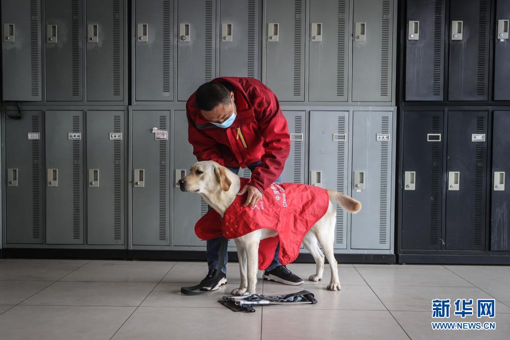 4月22日,中国导盲犬大连培训基地的训导员付明岩为在训犬“沐沐”穿戴装备准备进行训练。新华社记者 潘昱龙 摄