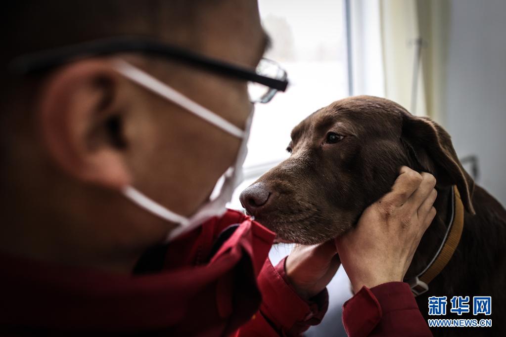 4月22日,中国导盲犬大连培训基地的训导员张新璐为在训犬“夏天”进行日常的身体情况检查。新华社记者 潘昱龙 摄