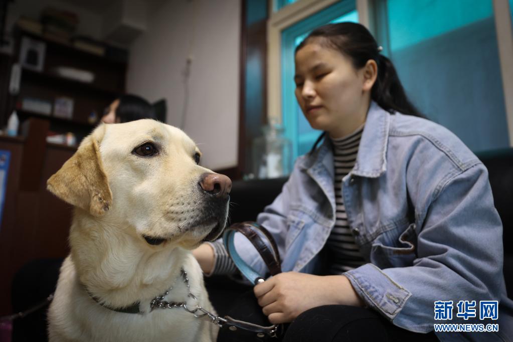 4月22日,来自新疆库尔勒的导盲犬使用者周雪荣与在训犬“艾德”在大连进行共同训练。新华社记者 潘昱龙 摄