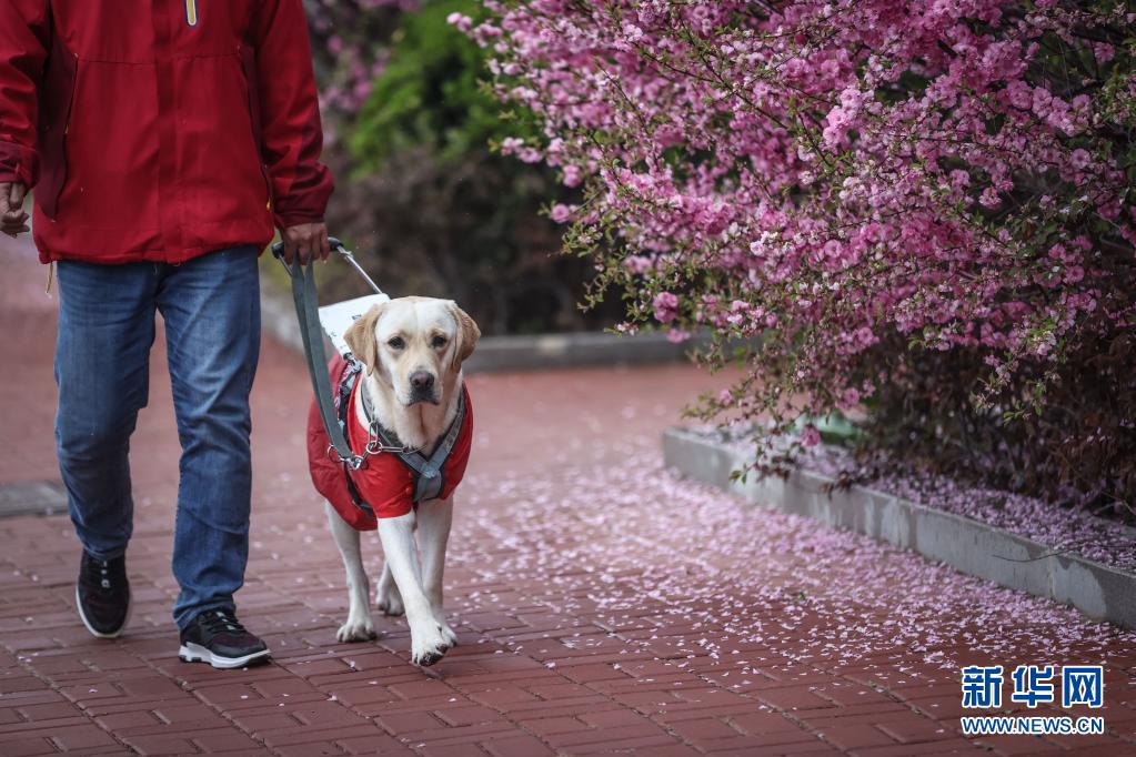 4月22日,中国导盲犬大连培训基地的训导员付明岩对在训犬“沐沐”进行训练。新华社记者 潘昱龙 摄