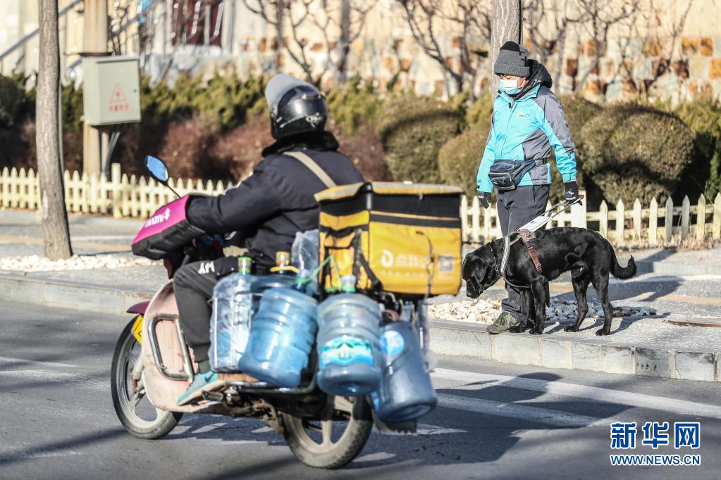 2020年1月14日,中国导盲犬大连培训基地的训导员徐坤在大连旅顺口区一处街道对在训犬Viking进行训练。新华社记者 潘昱龙 摄