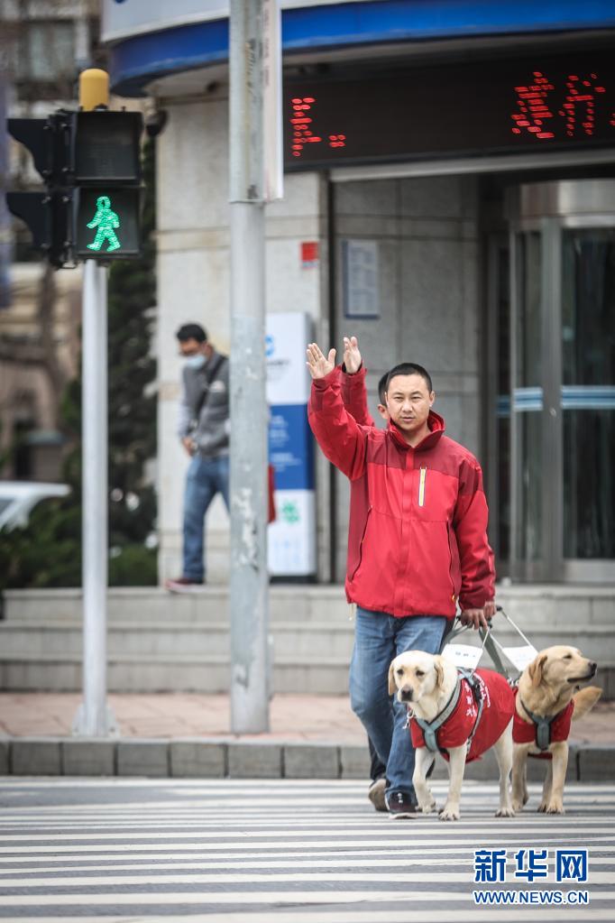 4月23日,中国导盲犬大连培训基地的训导员付明岩与在训犬“沐沐”(前)在训练中。新华社记者 潘昱龙 摄