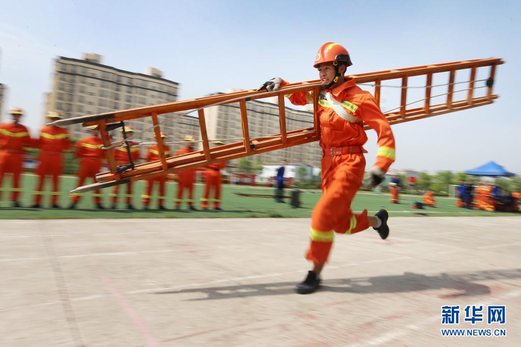 4月28日,在淮北市消防救援支队特勤站,消防员参加“60米肩梯登楼”项目比赛。