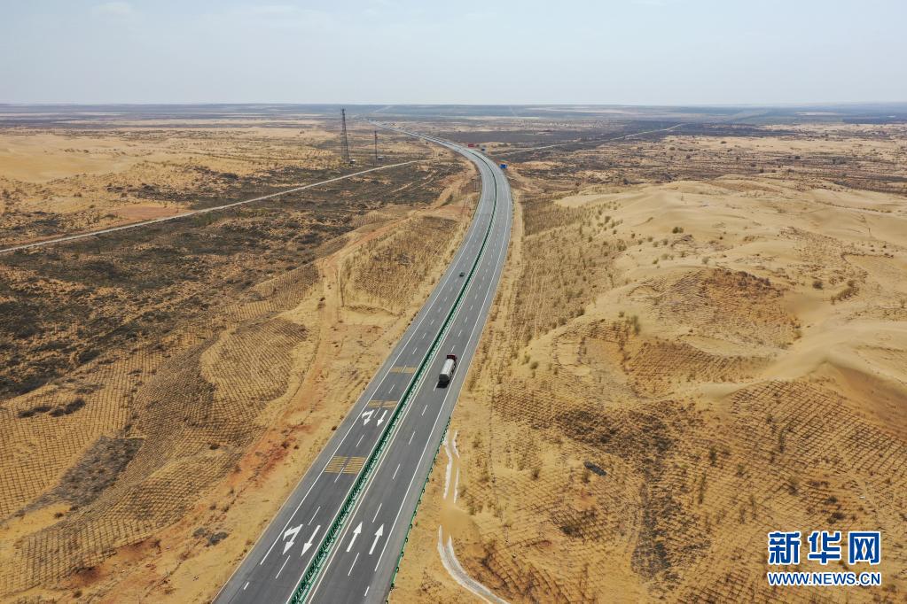这是杭锦旗境内被称作“穿沙公路”的省道215线(4月20日摄,无人机照片)。 新华社记者 李志鹏 摄