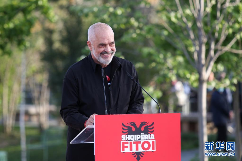 4月27日,阿尔巴尼亚现任总理、社会党领导人拉马在首都地拉那斯堪德培广场发表讲话。
