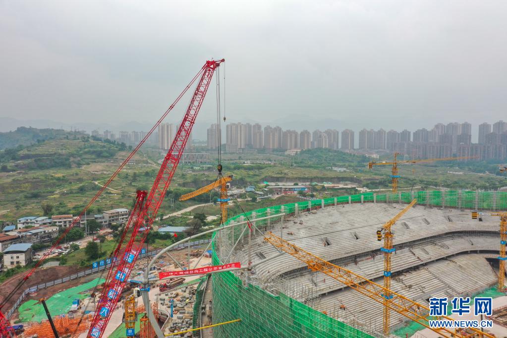 4月28日,中建八局施工人员在重庆龙兴足球场进行屋盖钢结构施工(无人机照片)。新华社记者 黄伟 摄