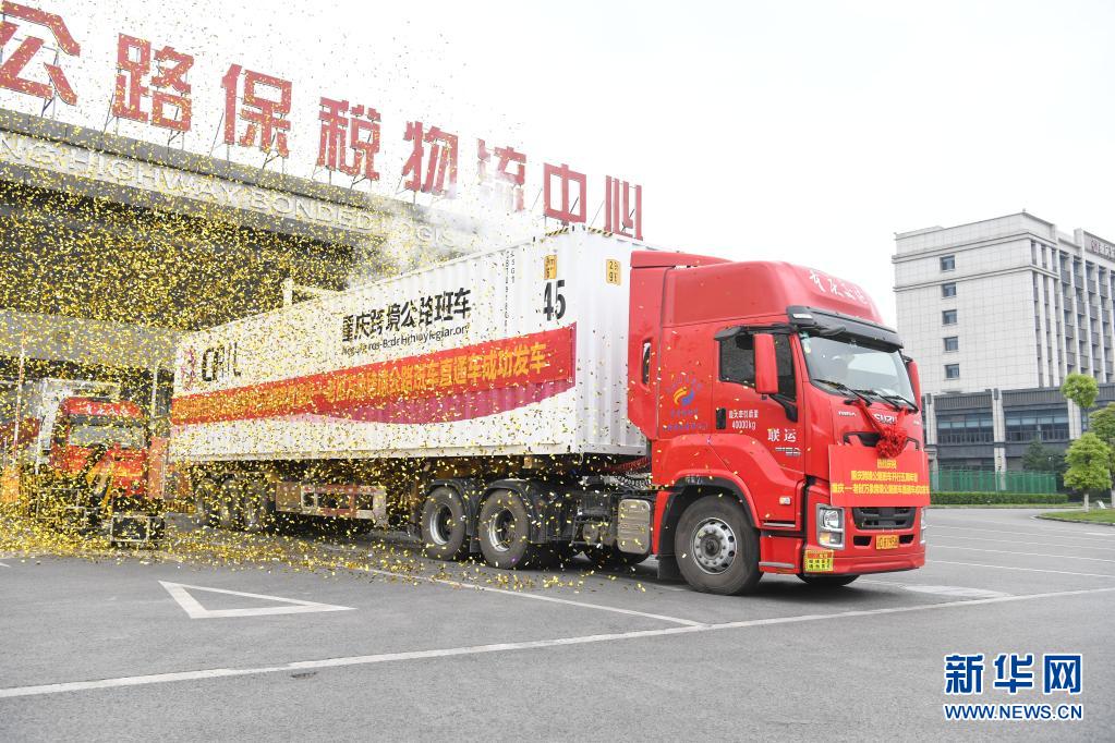 4月28日,重庆至老挝万象跨境公路班车直通车从重庆南彭公路保税物流中心驶出。新华社记者 唐奕 摄