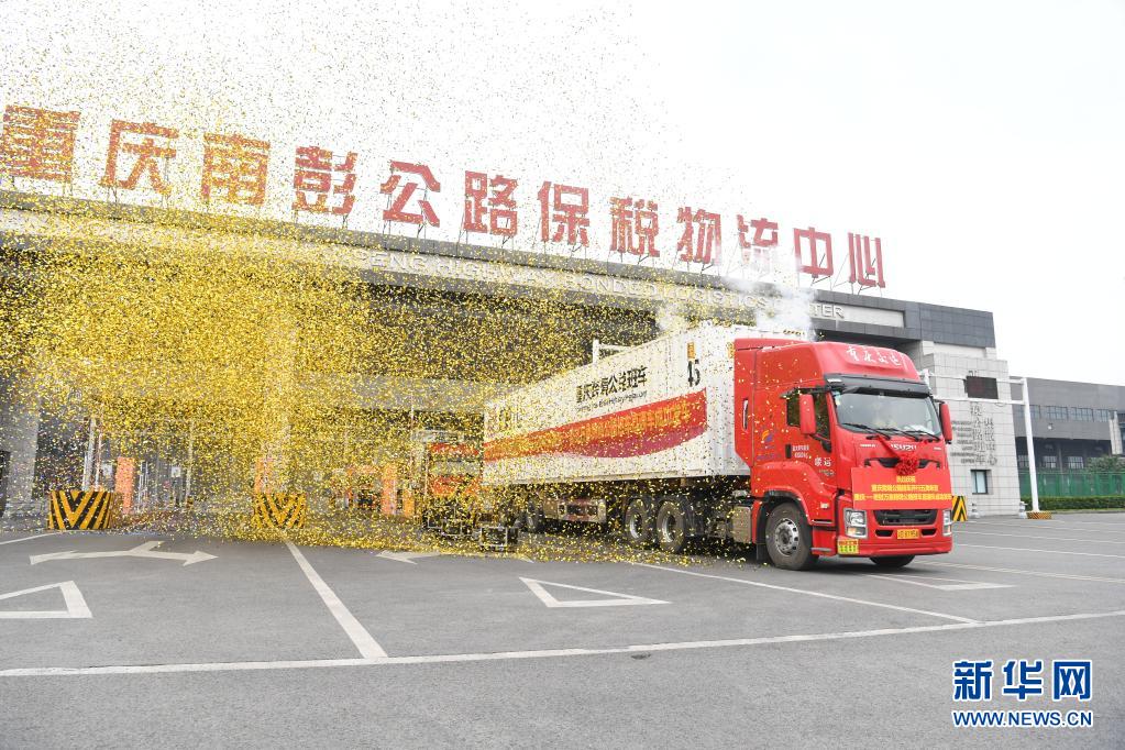 4月28日,重庆至老挝万象跨境公路班车直通车从重庆南彭公路保税物流中心驶出。新华社记者 唐奕 摄