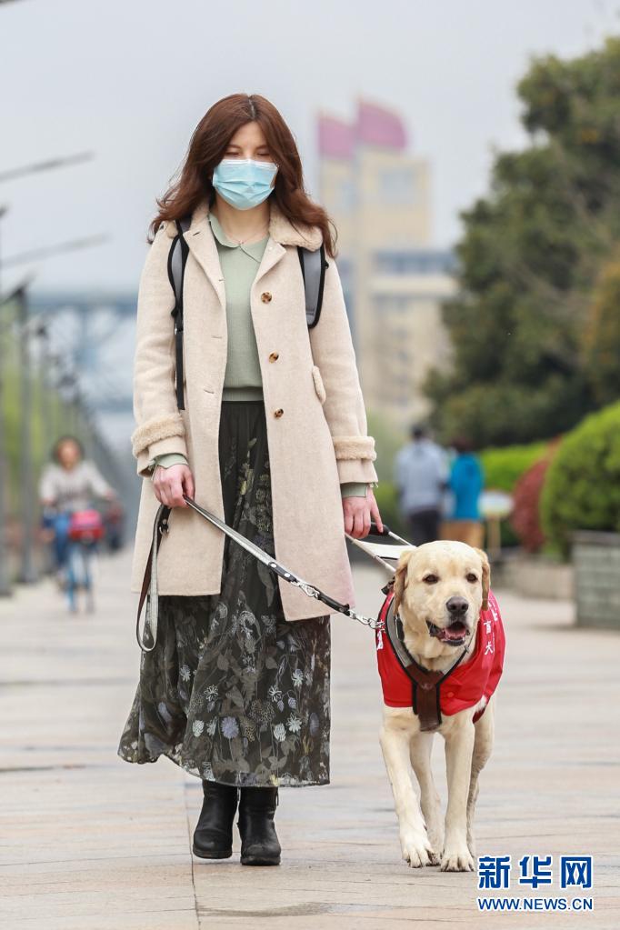 导盲犬“Bingo”陪伴李静在南京长江边的景观带散步(3月27日摄)。 新华社发 (张梦 摄)