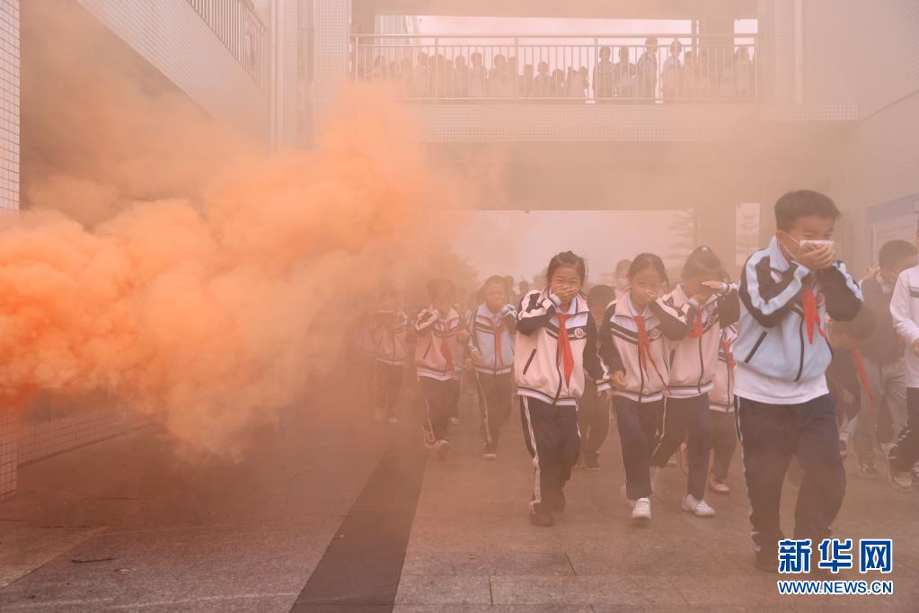 4月28日,在厦门市同安区大同第二中心小学,学生参加疏散逃生演练。