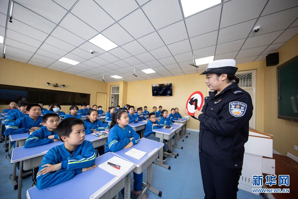 4月28日,河北省武安市交警大队交警在辖区小学为学生们讲解交通安全标识。