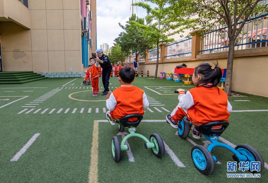 4月28日,河北省武安市交警大队交警在辖区幼儿园指导孩子们学习交通知识。