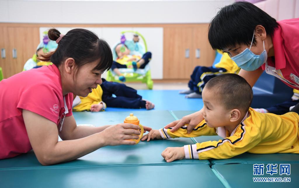 广东茂名市社会福利中心工作人员柯伟飞(左)在跟孩子互动交流(4月27日摄)。