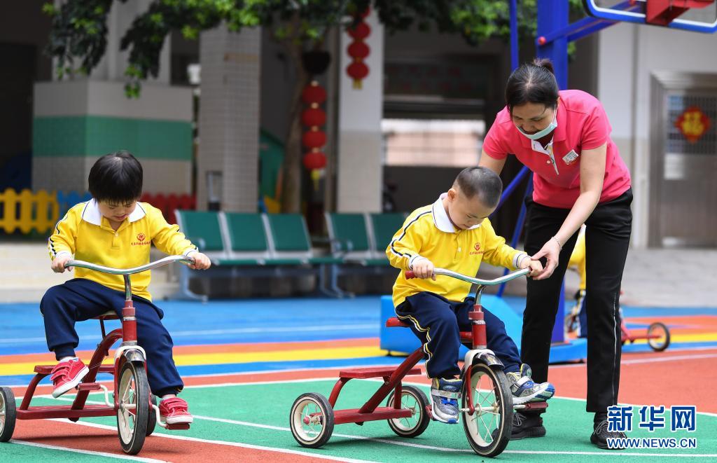 广东茂名市社会福利中心工作人员许彩华在教孩子骑车(4月28日摄)。