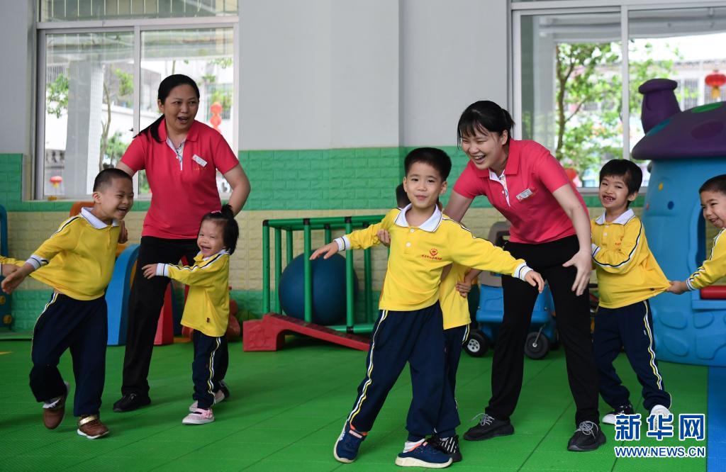 广东茂名市社会福利中心工作人员关葆玥(右)、李彩玲(左)在跟孩子做游戏(4月27日摄)。