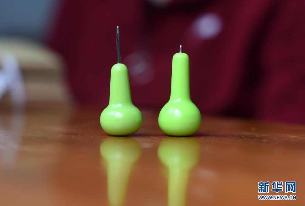 盲文笔笔头是合金材质、不易磨损,而叶景芬的一支盲文笔(右)因长期使用笔头已磨损殆尽(摄于4月28日)。新华社记者 韩传号 摄