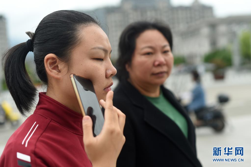 4月28日,叶景芬(前)和妈妈林凤玉走在龙泉市街头时接听电话。新华社记者 韩传号 摄