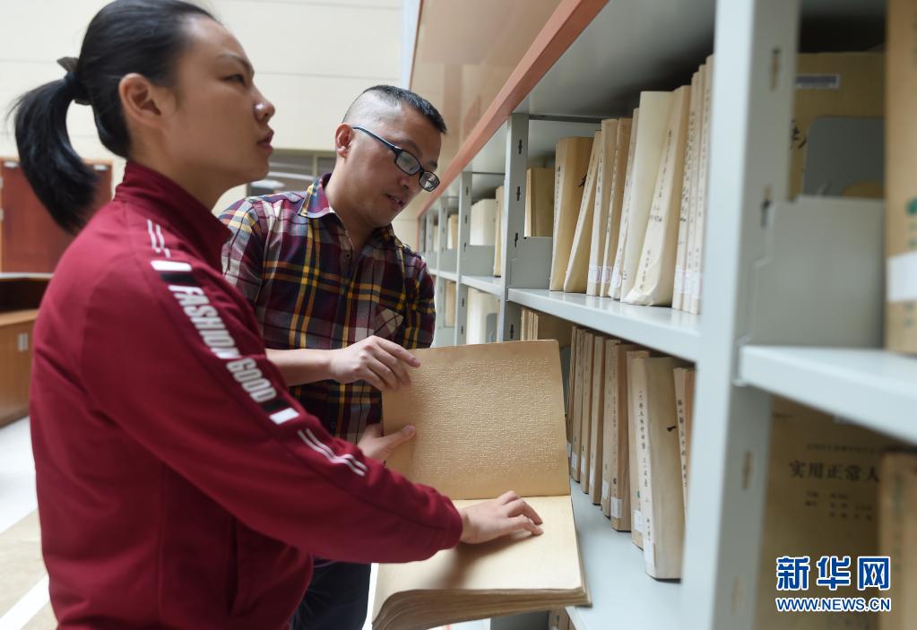4月28日,龙泉市图书馆工作人员陆军伟(后)向叶景芬介绍馆藏的盲文书籍。新华社记者 韩传号 摄