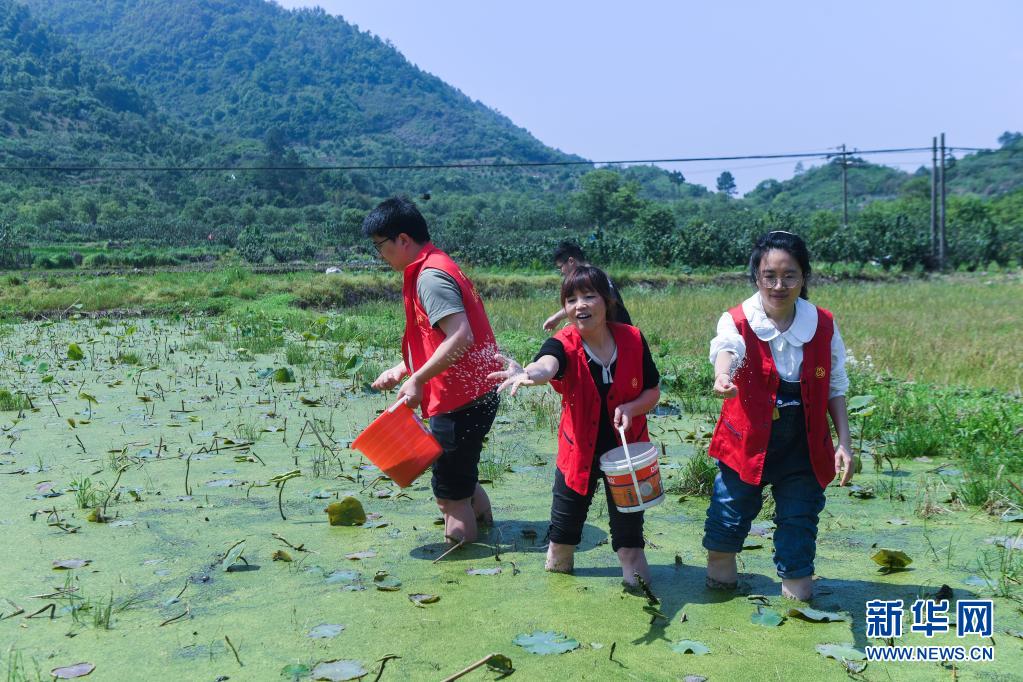 4月29日,赵家镇的榧乡红樱志愿者们在为泉畈村村集体的莲子塘抛洒肥料,保证夏季莲子增产增收。这片莲子塘的收益都用于村里的公益事业。